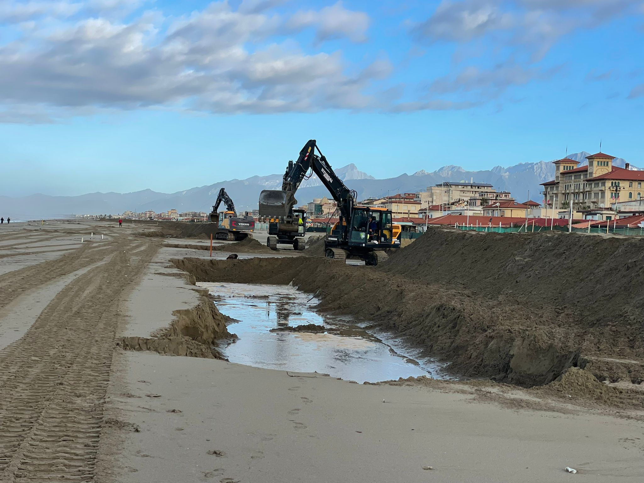 Temendo che già da questa sera, come da previsioni meteo, si ripetano altre, “mostruose” mareggiate, il Comune di Viareggio, con una procedura d’urgenza, si è attivato per far realizzare una nuova e più possente duna su tutto il fronte mare, dal porto fino al confine Nord, mettendo a riparo non solo gli stabilimenti balneari ma anche gli esercizi commerciali che si affacciano sui viali del lungomare.
