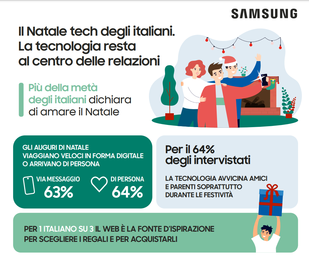 Il Natale risulta da sempre divisivo: c’è chi la trova una festa puramente consumista o subisce l’ansia dei panettoni già disposti nei supermercati da metà ottobre, e chi invece entra in modalità “Christmas On” al cambio dell’ora, pensando come decorare la casa, dove mettere l’albero, cosa cucinare a pranzo e cosa regalare. Ma se una sempre più diffusa narrazione ci vuole cinici e allergici alle festività, secondo i risultati dell’ultimo Trend Radar di Samsung, “Italiani e Natale, un mondo di connessioni”, la percentuale degli italiani che ama il Natale è invece molto alta, soprattutto tra giovani e giovanissimi. Lo studio , svolto su un campione di oltre 1.000 persone, ha esplorato il rapporto tra gli italiani e il Natale: quali sono le abitudini, che ruolo svolge la tecnologia, che cosa sognano di trovare sotto l’albero e che cosa regaleranno.