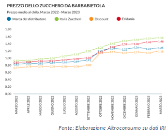 A marzo 2022 un chilo di zucchero di barbabietola costava in media 0,86 euro, a marzo 2023 costa 1,36 euro e il prezzo è in continua e costante crescita