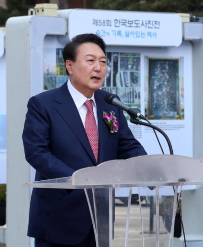 Yoon Suk-yeol, che si insedierà l’8 maggio, durante una visita