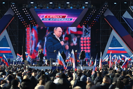 Lo zar con il costosissimo capo sul palco dello stadio di Mosca
