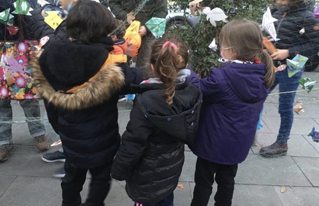 Bimbi puliscono rete pescatori da plastica e mettono pesciolini
