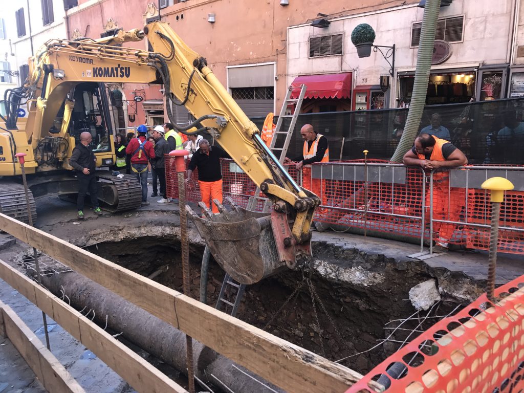 Il ritrovamento di un muro di presunta epoca romana blocca i lavori di ripristino del manto stradale. La voragine resta aperta e a disposizione degli esperti