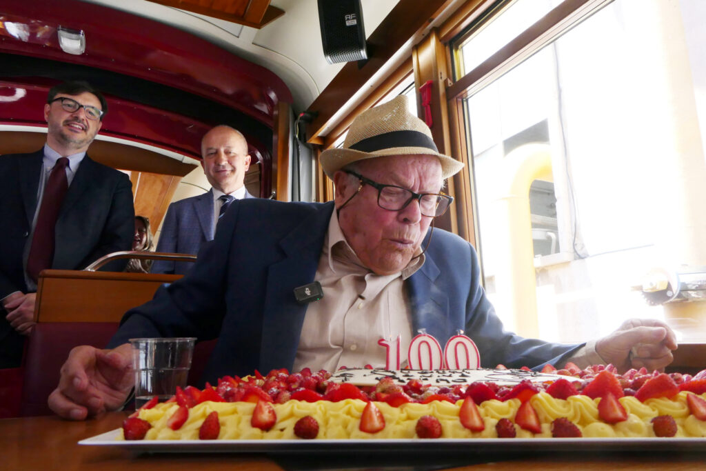 Emilio Polidori, ex tranviere dell'azienda dei trasporti della capitale, in pensione da oltre 40 anni, ha voluto celebrare il suo centenario nella sede centrale di via Prenestina, dove ha lavorato per 34 anni.