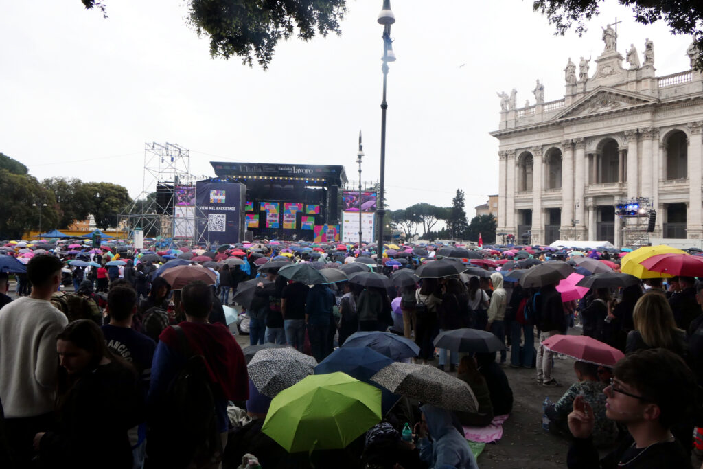 Un arcobaleno di ombrelli aperti e impermeabili colorati in piazza San Giovanni. A condurre la maratona musicale, con oltre 50 artisti in programma, Ambra Angiolini, per il sesto anno consecutivo, e Biggio