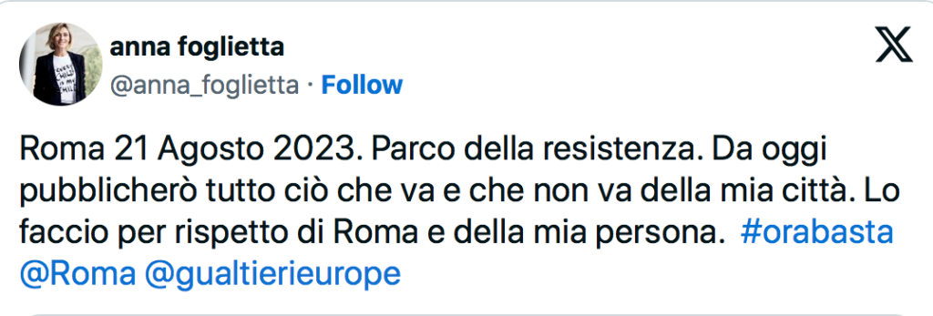 L'attrice su Twitter pubblica un video per documentare lo stato in cui versa il parco della Resistenza. "È un parco dove dovrei portare i miei figli a giocare. Mi fa schifo entrarci"