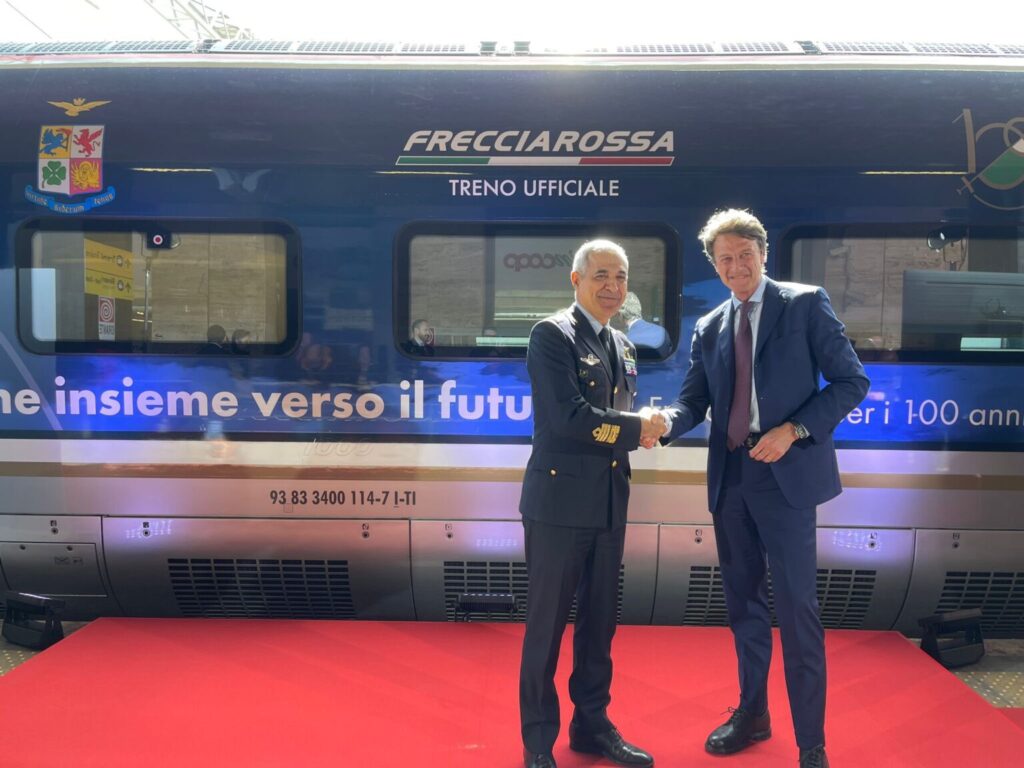 La livrea del treno è stata presentata oggi al binario 1 della stazione Termini di Roma dall’amministratore delegato di Trenitalia, Luigi Corradi e dal generale Aurelio Colagrande, sottocapo di Stato maggiore dell’Aeronautica militare