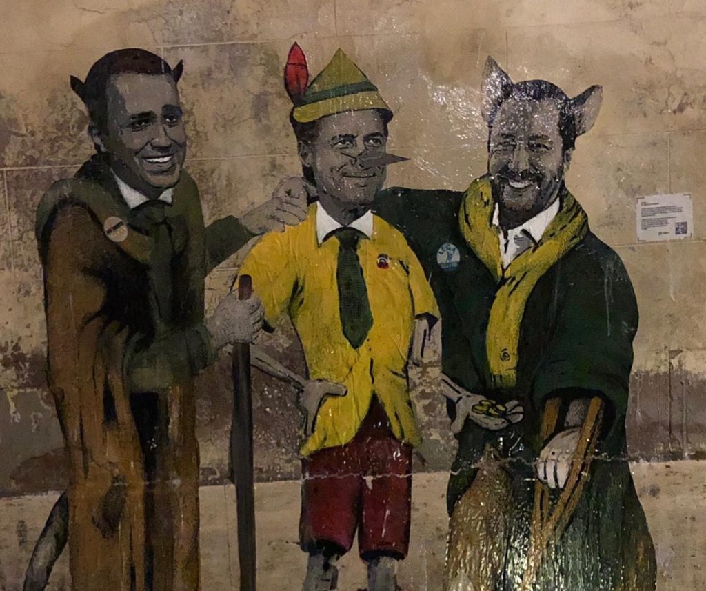 In via della Torretta l’opera di Tvboy ispirata alle critiche al premier da parte di Guy Verhofstadt, che lo definì un "burattino" nelle mani dei due vice
