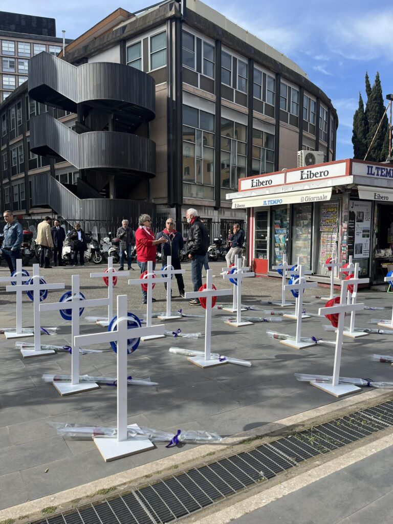 Davanti alla sede della Regione Lazio sono state dislocate decine di croci bianche, come in un cimitero, a cui sono stati appesi caschetti rossi e blu da operaio