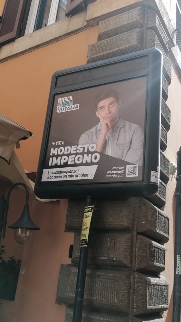 Davanti alle sedi dei principali partiti sono comparsi i manifesti di alcuni candidati piuttosto singolari. Si chiamano Massimo Supporto, Vera Vicinanza, Mina Ognibene e Modesto Impegno e portano il volto dei volontari di "One", l’Ong che vede tra i fondatori il cantante Bono degli U2