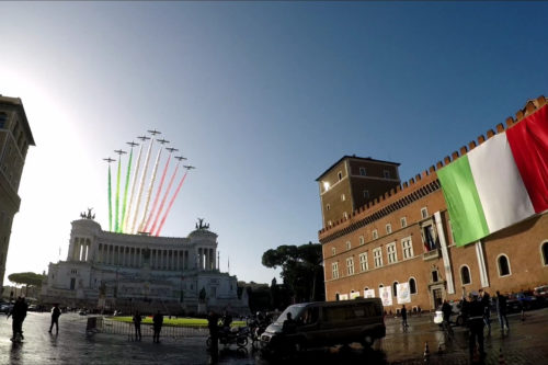 Presenti anche i capi delle tre forze forze armate. Al termine della cerimonia le Frecce tricolori hanno sorvolato piazza Venezia.