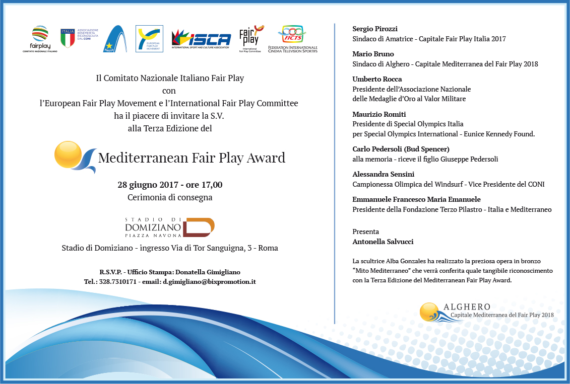 I premiati di questa edizione, presentata da Antonella Salvucci, che riceveranno la preziosa opera in opera in bronzo “Mito Mediterraneo”, realizzata dalla Scultrice Alba Gonzales, già inserita nelle iniziative speciali di Palermo Capitale della Cultura 2018, saranno Sergio Pirozzi, Sindaco di Amatrice, Capitale Fair Play Italia 2017; Mario Bruno, Sindaco di Alghero, Capitale Fair Play del Mediterraneo 2018; Umberto Rocca, Presidente dell’Associazione Nazionale delle Medaglie d’Oro al Valor Militare; Maurizio Romiti, Presidente di Special Olympics Italia per Special Olympic International – Eunice Kennedy Found; Carlo Pedersoli (Bud Spencer) – alla memoria- riceve il figlio Giuseppe Pedersoli; Alessandra Sensini, Vice Presidente del Coni e Campionessa Olimpica del Windsurf, Emmanuele Francesco Maria Emanuele, Presidente della Fondazione Terzo Pilastro – L’Italia e il Mediterraneo, e Francesco Ricci Bitti, Presidente Association of Summer Olympic International Federations (ASOIF). Per l’occasione si potranno degustare prodotti tipici e ammirare lo straordinario artigianato proveniente dalla Città di Alghero e tutto il territorio sardo.
