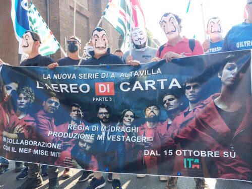 “L’aereo di carta, la nuova serie di Altavilla: regia di Mario Draghi, produzione di Vestager, in collaborazione con Mef, Mise e Mit”, si legge su uno striscione. “La preoccupazione sul territorio è altissima e coinvolge migliaia di famiglie – dichiarano dal presidio Marino Masucci, segretario generale della Fit Cisl del Lazio, e Stefania Fabbri, segretario regionale responsabile del dipartimento Trasporto aereo della Fit Cisl del Lazio -. Non abbiamo intenzione di arretrare un solo giorno finché non saremo ascoltati: chiediamo un piano di sviluppo e non di ridimensionamento, l’applicazione del Ccnl Trasporto aereo e continueremo a protestare contro le condizioni di lavoro unilaterali e i licenziamenti che ci vengono imposti”. In particolare al governo si chiede di intervenire nella vertenza Ita a tutela del lavoro e nel segno dell’occupazione per la realizzazione di condizioni dignitose e condivise.