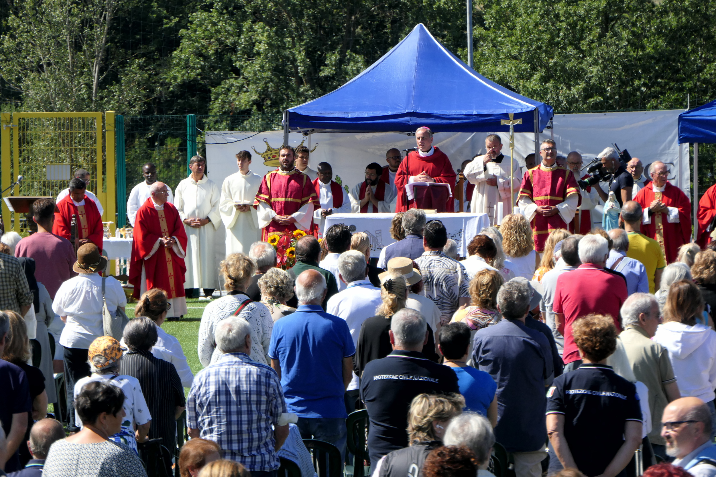 Centinaia di persone riempiono il campo sportivo di Amatrice, oggi trasformato in cattedrale, con le braccia conserte e lo sguardo basso. Sono fratelli, sorelle, mamme e papà delle 299 persone che la notte del 24 agosto del 2016 hanno perso la vita nel sisma che ha colpito la città e diversi comuni delle Marche e dell’Abruzzo. Tra loro la fascia tricolore spicca sul petto del sindaco di Amatrice, Giorgio Cortellesi. Intorno a lui il pubblico disposto a formare un ferro di cavallo avvolge l’altare a tendoni blu dove il vescovo di Rieti, monsignor Domenico Pompili, recita la messa. Dietro una montagna di calcinacci. “A prima vista tutto sembra fermo all’istantanea della torre che si erge solitaria in mezzo al deserto, ma se si guarda con più attenzione si scopre che nel centro storico c’è sotto un cantiere, finalmente in movimento”, ricorda Pompili durante la messa. “Appena più su nell’area di Don Minozzi, comincia a prendere forma la Casa del futuro. Appena più giù si delinea il nuovo ospedale di Amatrice. E poi ci sono gru, qua e là. Per vedere dunque bisogna venire”, sottolinea.