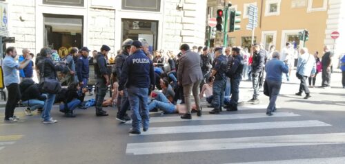 Nuovo blitz degli ambientalisti di Ultima Generazioni a Roma. Dopo le azioni sul Grande raccordo anulare gli attivisti si sono incatenati lungo le strisce pedonali di via del Tritone bloccando il traffico di piazza Barberini. La polizia, giunta sul posto intorno alle ore 10, ha subito fermato i sei attivisti per il clima che avevano scritto sulla schiena “stop fossile”.