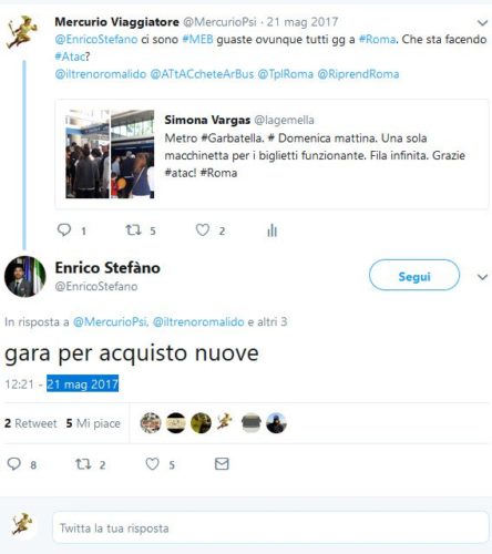 L’episodio è stato ripreso puntualmente da Mercurio Viaggiatore che ha posto l’accento sul fatto che il problema fosse noto da tempo. A tal punto che Enrico Stefàno, presidente della Commissione Mobilità di Roma Capitale, a maggio 2017 annunciava una gara per l’acquisto di nuove MEB.