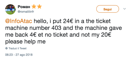 Stavolta la segnalazione è internazionale e riguarda un utente che pare abbia messo dei soldi all’interno di una macchinetta senza ricevere né i soldi né il biglietto: