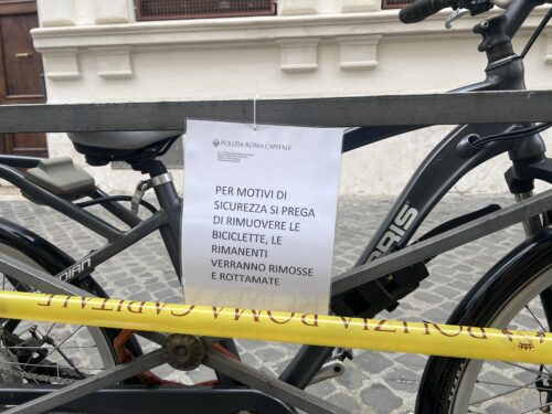 Sono mesi che quel luogo è diventato un parcheggio a cielo aperto per chi ha una bicicletta, anche per la presenza di forze dell’ordine giorno e notte nell’area, ma le bici potrebbero nascondere ordigni e comunque potrebbero essere un ostacolo in caso di evacuazione. Inoltre l’accesso a via Caetana da piazza delle Cinque Scole è interdetto da qualche giorno con una transenna.
