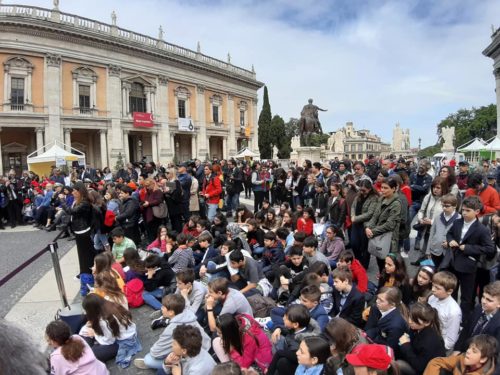 Piazza del Campidoglio invasa questa mattina dagli studenti che partecipano al primo ‘Villaggio per l’educazione ambientale’, iniziativa promossa dal ministero dell’Ambiente, in collaborazione con il ministero dell’Istruzione e il Comune di Roma.