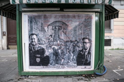 E’ stato rimosso il grande manifesto che ritraeva come in un quadro il ministro dell’Interno, Matteo Salvini, e quello della Giustizia, Alfonso Bonafede, con l’ex latitante Cesare Battisti che sfila tra la gente in piazza, messo alla gogna e pronto ad andare al patibolo in un’atmosfera di qualche secolo fa. Sotto, la scritta ‘L’ostensione del mostro, Italia 2019’. Era stato affisso sulla facciata di un chiosco nei nei pressi del ministero della Giustizia a Roma su Lungotevere dei Cenci, e rivendicata sui social dal collettivo antagonista ‘Militant’, che in un comunicato descriveva i due ministri come “due tronfi inquisitori di fronte ad una gogna”.