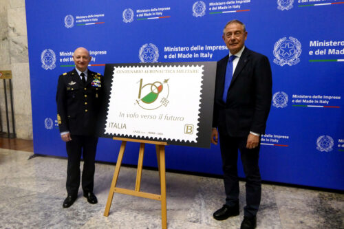 Il ministro delle Imprese e del Made in Italy, Adolfo Urso, insieme al capo di Stato maggiore dell?Aeronautica militare, generale di squadra aerea Luca Goretti, alla cerimonia di presentazione delle emissioni filateliche in occasione dei 100 anni dell?Aeronautica militare in corso a Palazzo Piacentini, Roma.