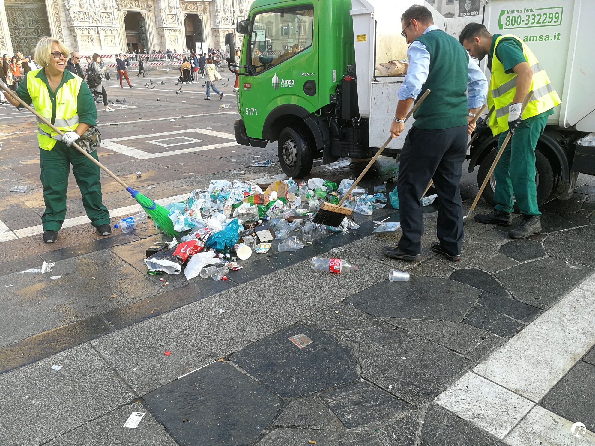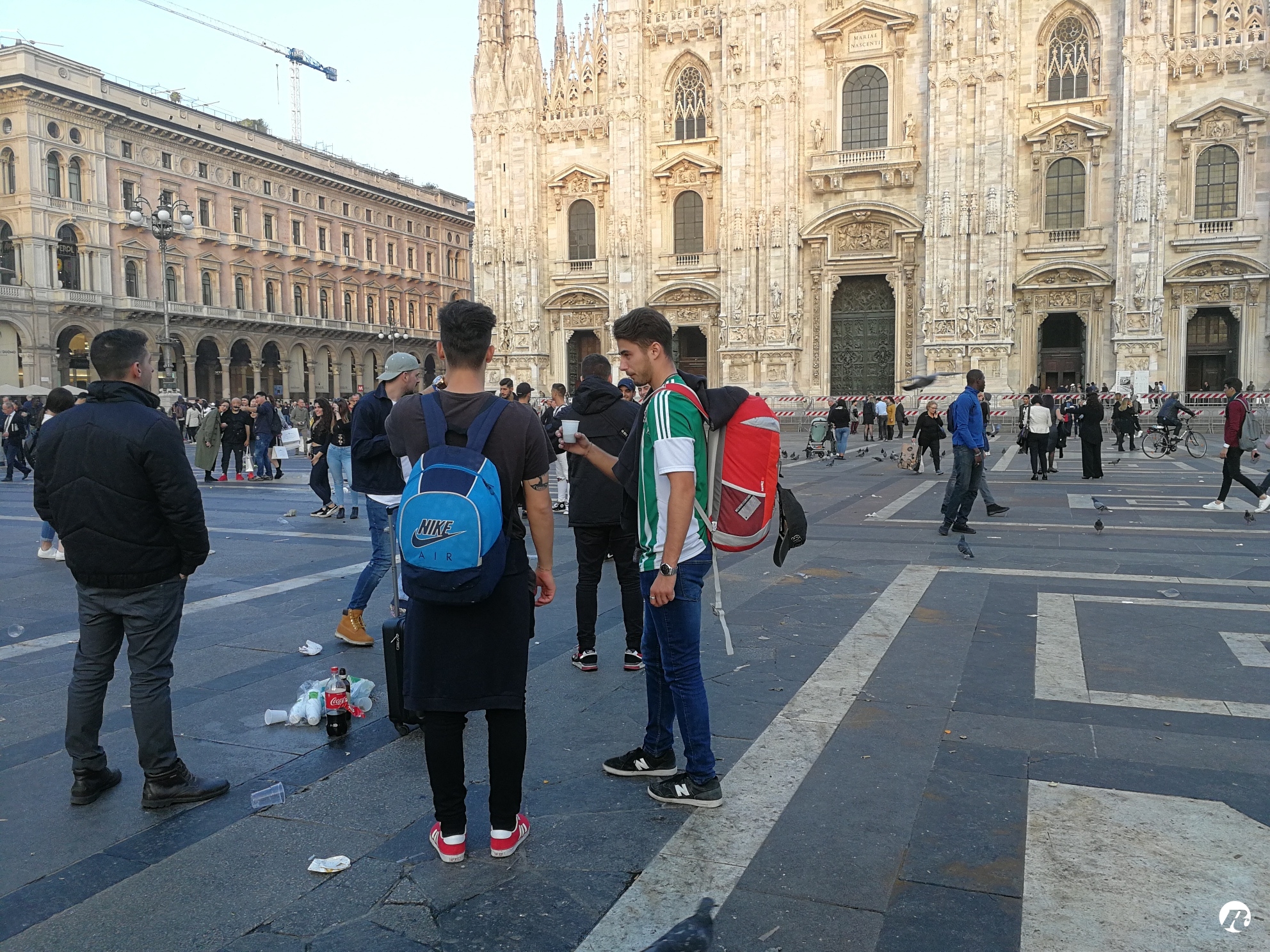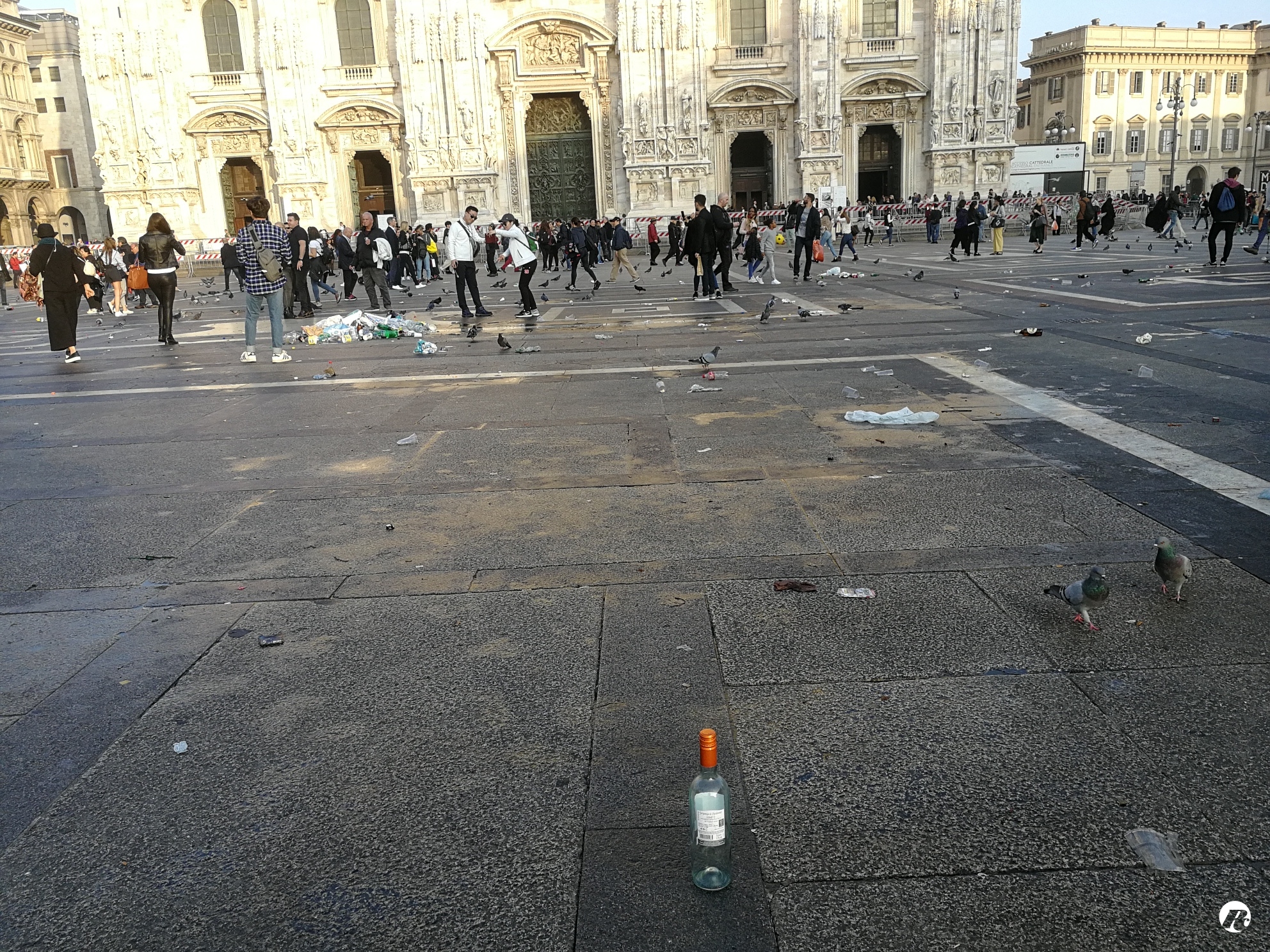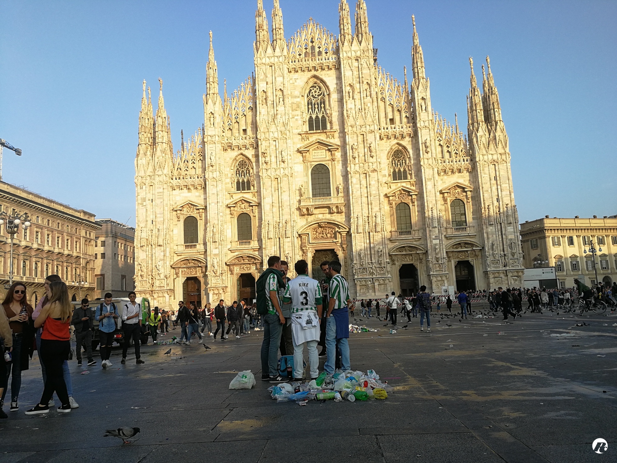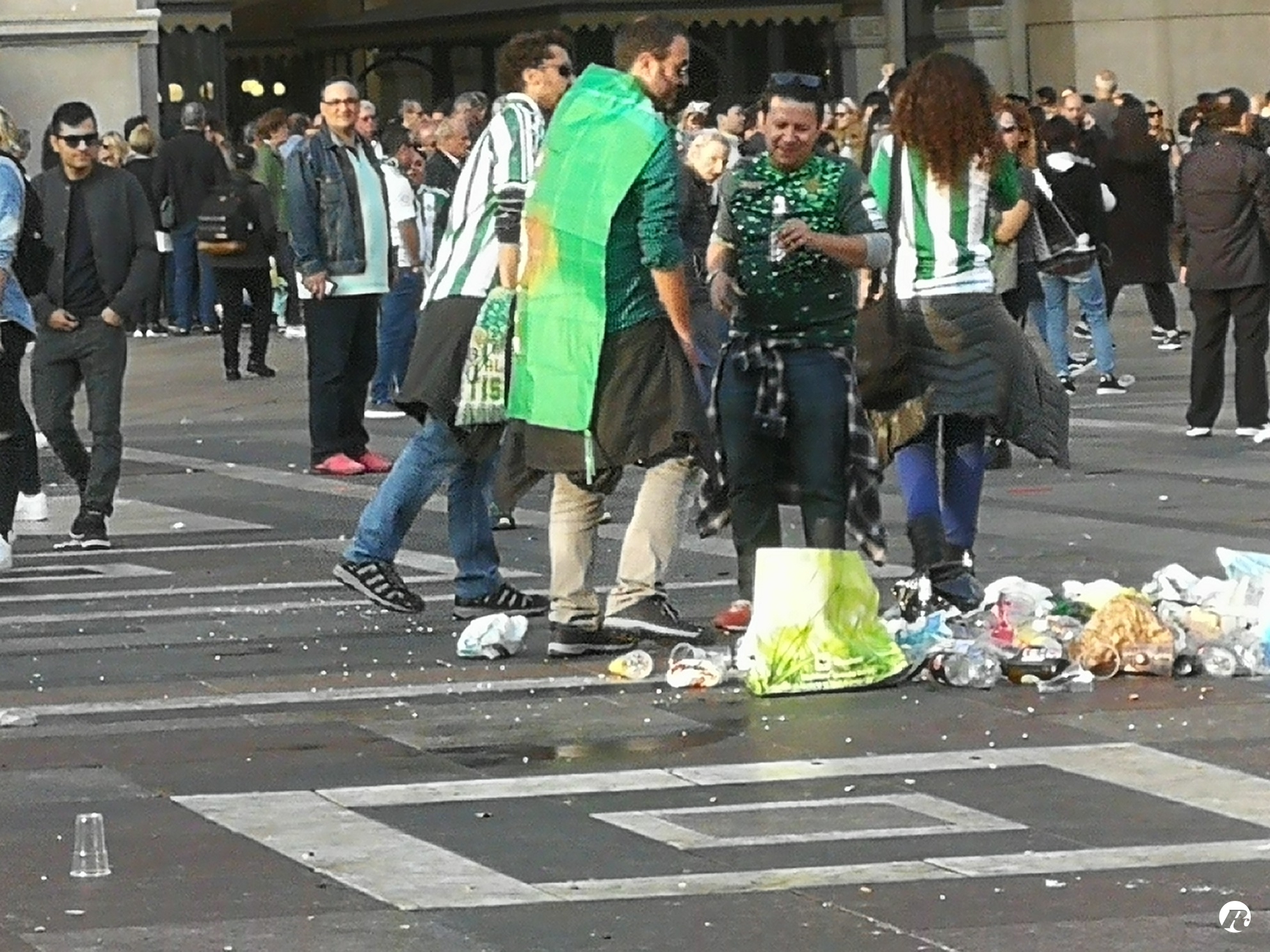 Tante maglie verdi in giro per Milano per tanti tifosi del Siviglia. Ma non un retake. E’ il solito squallido film che si ripete ad ogni partita importante. Come ovvio il punto di incontro è piazza del Duomo. Difficile passare, tra cumuli di immondizia, vetri rotti, sacchetti e il pavimento del sagrato “allagato” da birra, vino e quant’altro. A Marsiglia negli stessi minuti si menano di santa ragione.