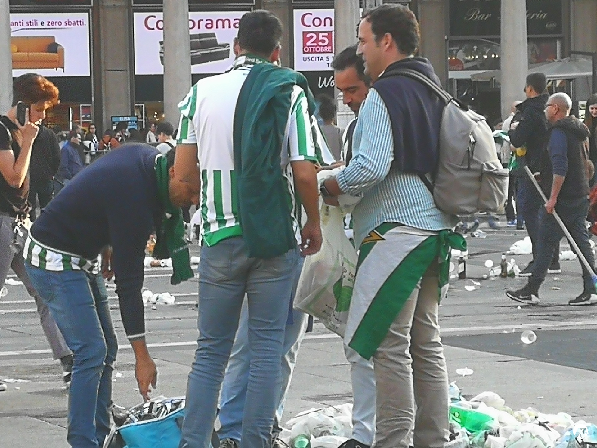 A Milano, invece, sembra l’October fest. Si sa l’alcol riscalda gli animi e quando cominciano gli spintoni tra la tifoseria del Betis tutti prendono il largo. Anche gli spazzini si defilano per qualche momento; non si sa mai! Le forze dell’ordine aumentano silenziosamente e cominciano a girare gli elicotteri. Poi improvvisamente quasi tutte le maglie verdi prendono la via dello stadio e piazza del Duomo, piano piano, ritorna nelle mani dei turisti. I piccioni non sono mai stati tanto allegri come stasera! A furia di bere dalle pozze di birra sono “ciucchi” anche loro.