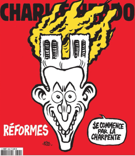 Il settimanale satirico Charlie Hebdo ha dedicato la copertina all’incendio di Notre-Dame. Un disegno mostra Macron con la cattedrale in fiamme sulla testa. Il presidente sorride in modo crudele e ha le torri di Notre-Dame in testa come una corona, dalla quale si alzano le fiamme. Macron dice “riforme: io comincio dalla struttura”.