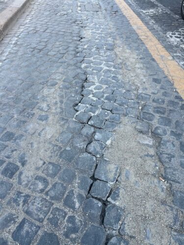 Una parte della pavimentazione è infatti già saltata; ampie porzioni non sono in linea col resto della strada, bisognerà dunque capire che cosa succederà quando pioverà in modo copioso; le giunzioni tra un sampietrino e l’altro sono state fatte di un colore differente dal resto. Tra l’altro, la strada fu rifatta durante l’era Raggi, realizzando un sottostrato in cemento armato, in modo da rendere più stabili i sampietrini. Lo stesso accorgimento è stato usato anche nel rifacimento della pista ciclabile per far passare i cavi 5G?