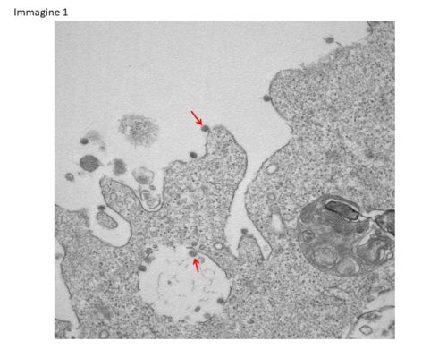 Nella foto si osservano chiaramente, ad un ingrandimento di 30000X, le particelle virali di Sars-CoV-2 (indicate dalle frecce), adese alle membrane sulla superficie e all?interno di cellule Vero E6 utilizzate per l?isolamento. (Foto: Statale di Milano)