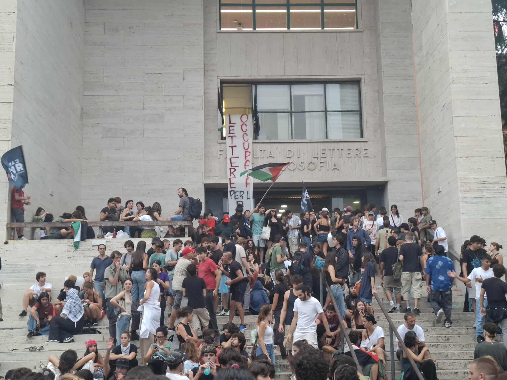 ‘Blocchiamo tutto, noi la guerra non la vogliamo’. Dopo aver calato una grande bandiera palestinese, gli studenti di Sapienza contro la guerra, insieme ai movimenti Cambiare Rotta e a diversi collettivi universitari, sono entrati dentro scienze politiche bloccando le le lezioni, e battendo sulle aule, hanno annunciato di di aver occupato la facoltà di Scienze Politiche dell’ateneo romano. L’azione è arrivata al termine di un corteo studentesco che ha attraversato la città universitaria, passando in varie facoltà e dipartimenti. La mobilitazione è stata lanciata in solidarietà con la Palestina e a sostegno della Global Flotilla.