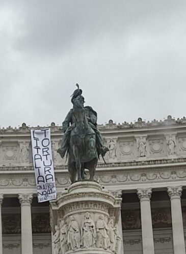 Lo striscione esposto sull'Altare della Patria, a Roma.