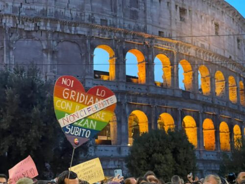 Centinaia di persone sono scese ieri pomeriggio in piazza a Roma, a pochi metri dal Colosseo, per manifestare a sostegno del ddl Zan, mentre a Milano almeno in diecimila si sono riversata al presidio all’Arco della Pace promosso da Sentinelli, Arcigay, Coordinamento Arcobaleno e altri.