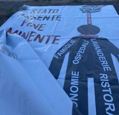 “Stato assente, fine imminente”, recita il cartello. I manifestanti provengono da ogni regione d’Italia e strette tra le mani tengono le ultime bollette delle loro attività. Uno di loro alza il telefonino e mostra il conto in rosso: meno 31 mila euro. Si sono riuniti nel primo pomeriggio di oggi, alcuni hanno preso il treno all’alba, e chiedono all’unisono che “arrivi a giorni la soluzione al caro bollette”.