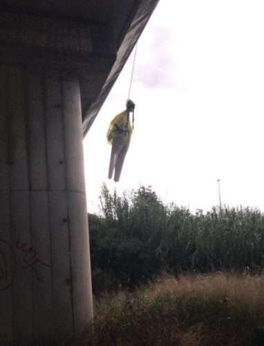 Un fantoccio che rappresenta la nota attivista Greta Thunberg è stato stamattina appeso con una corda sotto al ponte in via Isacco Newton, a Roma. Alla sagoma, con treccine e mantellina anti-pioggia, era attaccato un cartello con su scritto: “Greta is your God”. Sul posto la polizia.