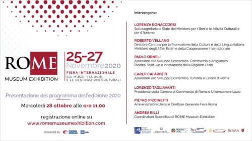 Venti incontri, 80 speaker, 20 buyer internazionali, 300 B2B, oltre 70 aziende parteciperanno alla terza edizione della più’ qualificata ed estesa Fiera del settore culturale, ideata quest’anno completamente on line. La piattaforma romemuseumexhibition.com consentirà di visitare la mostra, assistere a dibattiti e organizzare incontri in modalità virtuale.