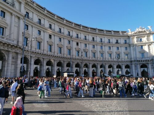 Su viale Enrico di Nicola quattro blindati della polizia bloccano le auto, i poliziotti sono dispiegati su tutta la via. Nel frattempo il corteo è partito e sta percorrendo via Giovanni Amendola. Sono già alcune migliaia, quasi tutti gruppi di studenti, che si stanno radunando in piazza della Repubblica a Roma per dar vita al corteo dei Fridays for Future, la manifestazione organizzata dai movimenti ambientalisti che si battono per promuovere iniziative contro il cambiamento climatico. Piazza della Repubblica, e in particolare, tutte le vie di accesso, sono interdette al traffico e sono presidiate dalle forze dell’ordine.