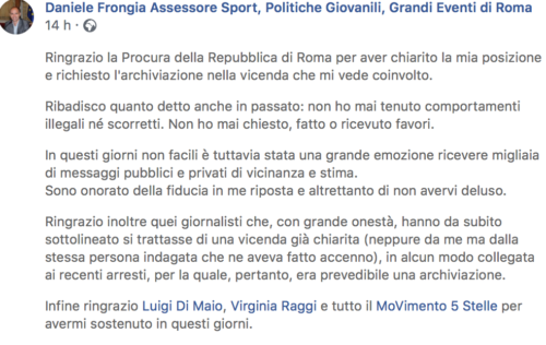 La sindaca Virginia Raggi ieri sera ha annunciato il ritorno ufficiale in giunta dell’assessore allo Sport Daniele Frongia, dopo che la Procura di Roma ha chiesto l’archiviazione della sua posizione nell’ambito del filone principale dell’inchiesta sul nuovo stadio della Roma