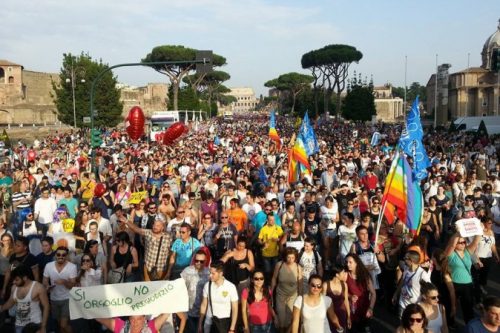 “Abbiamo il diritto di essere diversi. Sotto Santa Maria Maggiore facciamo il miracolo dell’ arcobaleno. Dove c’è amore c’è famiglia” gridano gli attivisti gay dal carro principale durante la manifestazione del gay Pride, in corso a Roma. La manifestazione parte da piazza della Repubblica per arrivare a piazza Madonna di Loreto, e, secondo gli organizzatori, vi stanno partecipando 700 mila persone.