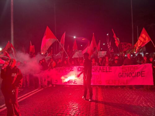 Al motto di “sciopero generale” ieri notte piazza dei Cinquecento, di fronte alla stazione Termini a Roma, si è gremita di manifestanti, radunati a centinaia e intenzionati a raggiungere palazzo Chigi dopo che si era diffusa la notizia dell’abbordaggio israeliano sulle barche della Global Sumud Flotilla dirette a Gaza, per portare aiuti umanitari alla popolazione palestinese.