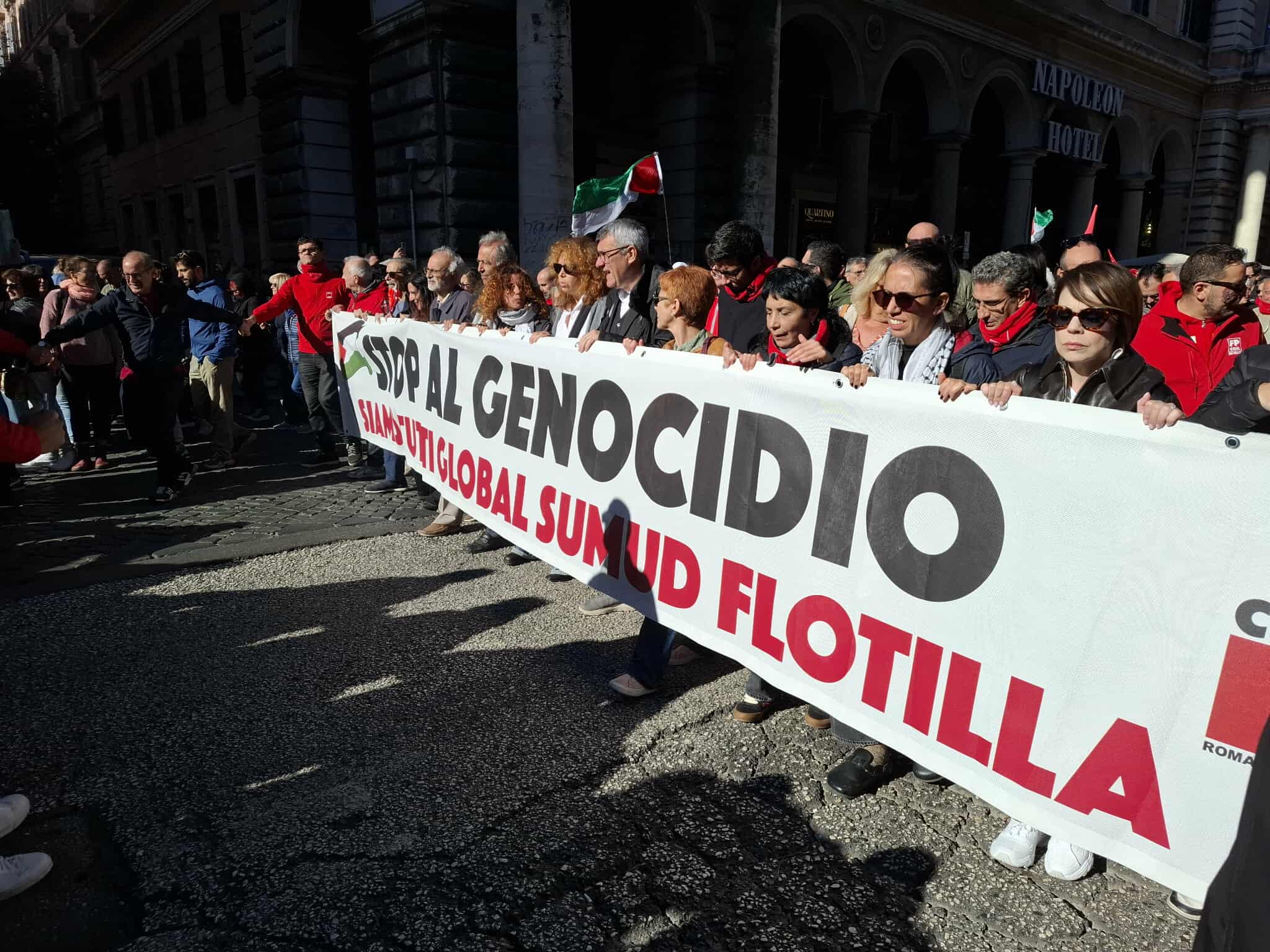 È partito da piazza Vittorio, a Roma, il corteo organizzato dalla Cgil in occasione dello sciopero generale di 24 ore di tutti i settori pubblici e privati indetto dai sindacati Cgil, Usb, Cub, Sgb e Cobas a sostegno della popolazione di Gaza e della missione Global sumud flotilla. I manifestanti hanno imboccato via Emanuele Filiberto dietro a un grande striscione che recita “Stop al genocidio, siamo tutti Global sumud flotilla”, e sono diretti a piazza dei Cinquecento, davanti alla stazione Termini, che riunirà tutte le associazioni e i sindacati oggi in sciopero. Alla testa della manifestazione sono presenti, tra gli altri, il segretario generale della Cgil, Maurizio Landini, il segretario generale della Cgil di Roma e del Lazio, Natale Di Cola, e il presidente della Comunità palestinese di Roma, Yousef Salman.