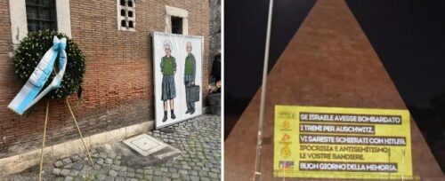 Un messaggio contro le Organizzazioni non governative (Ong) e’ stato proiettato nella notte sulla Piramide Cestia e altri edifici di Roma in occasione del Giorno della Memoria. “Se Israele avesse bombardato i treni per Auschwitz, vi sareste schierati con Hitler. Ipocrisia e antisemitismo le vostre bandiere. Buon Giorno della Memoria”, e’ il testo del mega cartello proiettato nella notte su una parete della Piramide Cestia e sul Palazzo della Fao a Roma. Accanto alle frasi, sono stati proiettati anche i loghi di Amnesty, diventata “Amnesy” ed Emergency “Hypocrisy”. Nel mirino dell’attacco sono finiti anche l’Anpi, Medici senza frontiere e la Croce Rossa. Il messaggio e’ stato riprodotto su uno sfondo giallo, in riferimento alla commemorazione delle vittime della Shoah, il 27 gennaio 1945, giorno in cui l’esercito sovietico entro’ nel campo di concentramento di Auschwitz, rivelandone al mondo l’orrore.