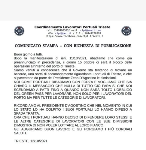 Polemica sul green pass nei porti. Una circolare del Viminale raccomanda alle imprese “di mettere a disposizione del personale sprovvisto di green pass test molecolari o antigenici rapidi gratuiti”. Poi precisa che gli operatori economici “potranno valutare”. Dal 15 ottobre, se non verrà ritirato l’obbligo del green pass, stop alle attività del porto di Trieste. Le società di gestione al porto di Palermo non si faranno carico dei tamponi ai portuali. Il Comitato dei lavoratori del porto di Trieste se non verrà ritirato l’obbligo del Green Pass nei luoghi di lavoro, bloccherà le attività.