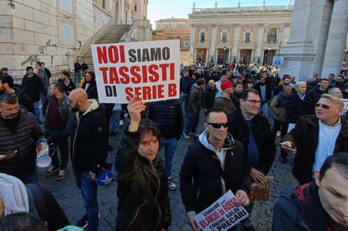 Protesta in piazza del Campidoglio dei tassisti sostituti alla guida, che operano al posto degli effettivi titolari della licenza, pagando loro un canone. Da stamattina un centinaio di persone sono in presidio con cartelli, fischietti e slogan urlati al megafono. Poco fa una decina di loro si sono incatenati a un passamano. Diversi gli striscioni esposti lungo le mura che costeggiano le scale, tra cui uno in cui si legge: “No al titolo oneroso”.