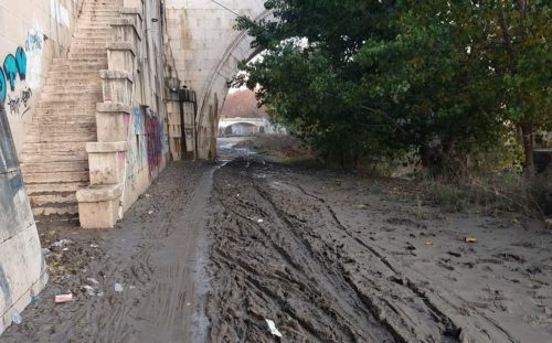 L’immagine sembra rappresentare un luogo da poco colpito da un’alluvione. Una strato di fango che, come si può vedere dalla foto pubblicata sul sito Salvaiciclisti-Roma, rende difficoltosa sia la pedalata che una semplice passeggiata sul Tevere. Siamo a Roma, all’altezza di Castel Sant’Angelo. Nonostante le apparenze inducano a pensare che qualche cataclisma si sia abbattuto da poco sulla Capitale, quel residuo di fango, acqua e detriti è frutto dei grandi acquazzoni del mese scorso, alimentanti da qualche sporadica pioggia dicembrina: