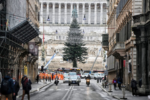 Quasi concluso l’allestimento a piazza Venezia dell’albero di Natale più chiacchierato del Paese