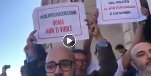 “Se c’è un po’ di dignità si torna alle elezioni, è il peggior sindaco dal dopoguerra a oggi. Sarà brava a fare l’avvocato, la mamma, la cuoca ma il sindaco non è il suo mestiere”, ha aggiunto mentre i suoi sostenitori lo hanno accolto con bandiere della Lega e uno striscione ‘Raggi dimettiti’.