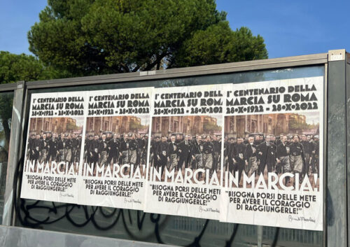 A poche ore dal centenario della Marcia che sancì la presa di potere da parte di Benito Mussolini, sono stati affissi sui muri di Roma manifesti celebrativi con tanto di firma, fotografia e citazione del duce. Comparsi a Parioli e in altri quartieri della Capitale, i manifesti hanno fatto scattare la reazione del Campidoglio, con il sindaco Roberto Gualtieri che, nell’annunciarne l’immediata rimozione, li ha bollati come “inaccettabili e vergognosi”, aggiungendo che “Roma, Medaglia d’oro al valore militare per la Resistenza, è e sarà sempre antifascista”. Netta l’indignazione del Pd, che per bocca di Valeria Baglio, si augura che “le altre forze politiche non rimangano in silenzio”.