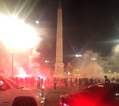Ieri c’è stato un maxi raduno di tifosi in pieno centro a Roma. Con fumogeni, petardi e bandiere della Roma, hanno festeggiato il compleanno della squadra. Il raduno si è diviso in due tronconi, uno verso via del Corso e l’altro in piazza del Parlamento. Le strade assomigliano alla curva sud. La zona è stata presidiata dalle forze dell’ordine.