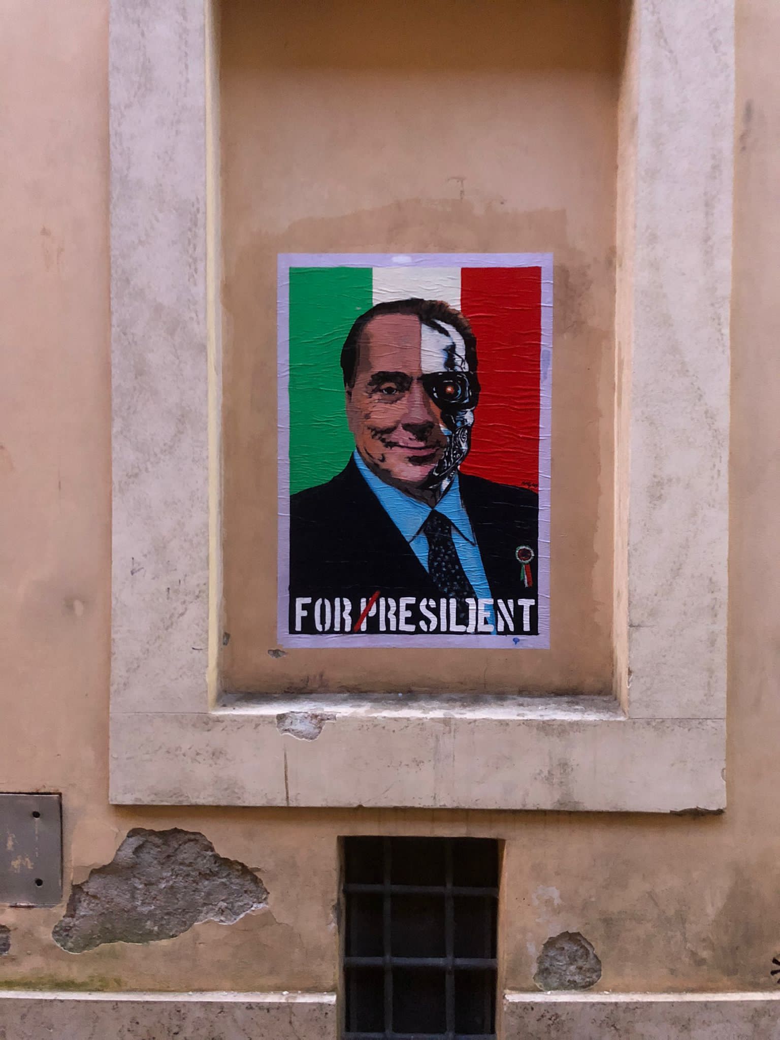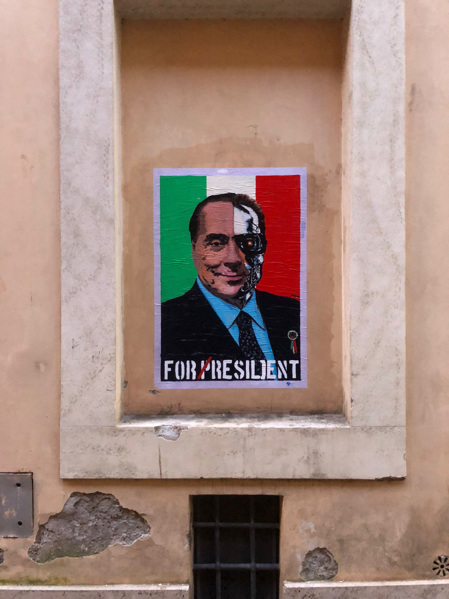 Metà Silvio Berlusconi, metà Terminator: in vista delle prossime elezioni per il presidente della Repubblica, e in attesa che il presidente di Forza Italia Silvio Berlusconi sciolga la riserva, ecco un nuovo murale di Harry Greb, a vicolo dei Granari, alle spalle di piazza Navona. L’immagine dell’ex presidente del consiglio, è ritratta sulla bandiera italiana. Il suo volto però, non è del tutto umano. La “locandina”, che dovrebbe candidarlo “For president”, ha però una correzione sul testo, che diventa: “For resilient”.
